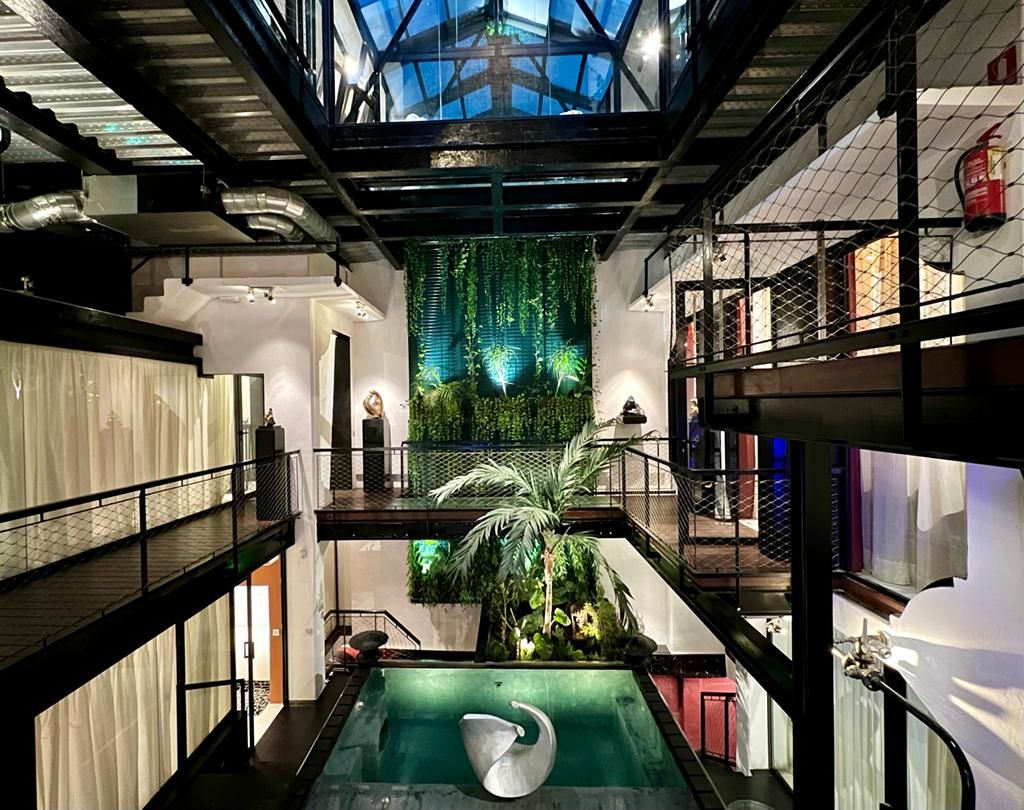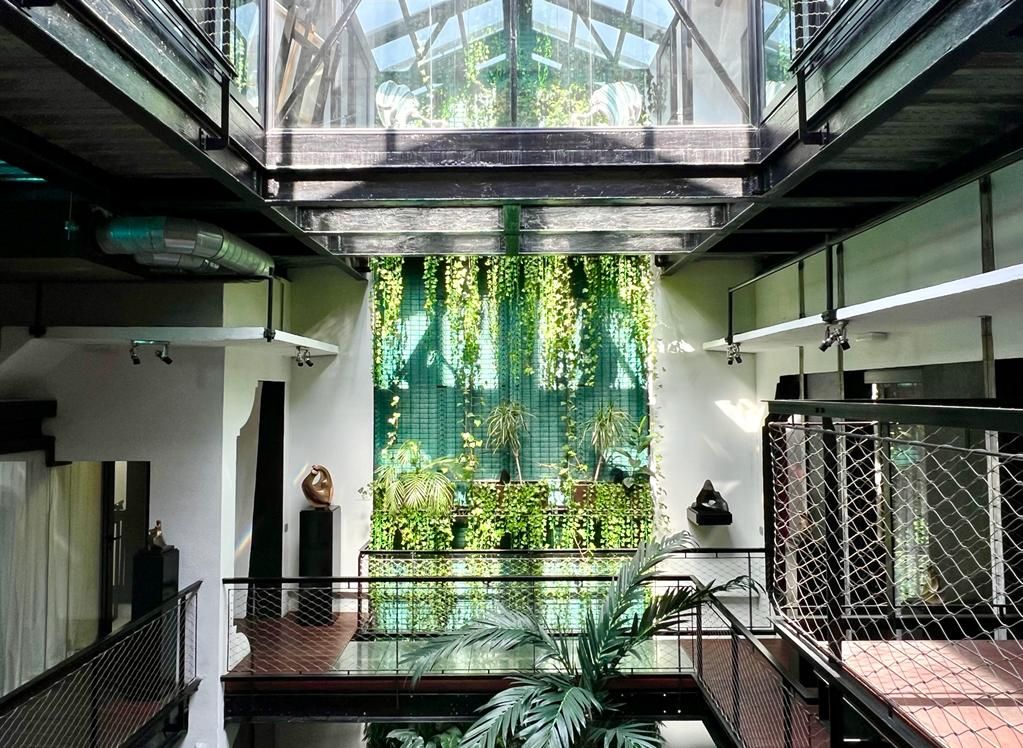 Après la vente de La Nao, son ancienne demeure contemporaine barcelonaise d’exception, Erik Morvan décide de rénover et de “ bousculer ” ce bâtiment industriel historique; mais comment mettre en mouvement un lieu de travail et de vie dans une immense coquille de murs en pierre et en briques apparentes, aux volumes rendus vertigineux par les 12 mètres entre la dalle et la flèche de la charpente ? Son ingéniosité et son inspiration mêlée, font que d’architecte il devient créateur ! Il réussi, d’une façon quasi mystique, à remplir ce vide par un cylindre de vie sur trois niveaux, par des jardins suspendus et des murs végétaux, créant ainsi une planète de lumière et d’espace au cœur de ce lieu singulier. La volumétrie donne la sophistication au lieu et l’on ressent instinctivement sa compréhension de nos univers multiples hors de l’échelle humaine ou terrienne, tant ce lieu hors du commun et hors du temps, nous transporte dans une autre galaxie.