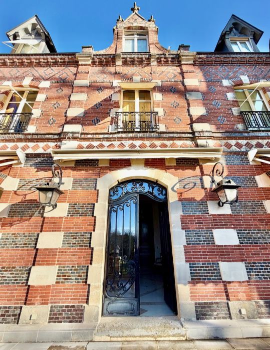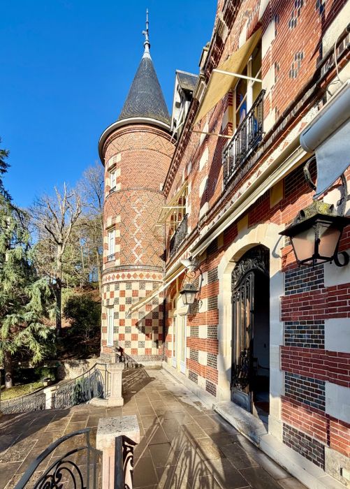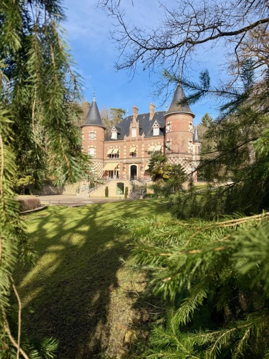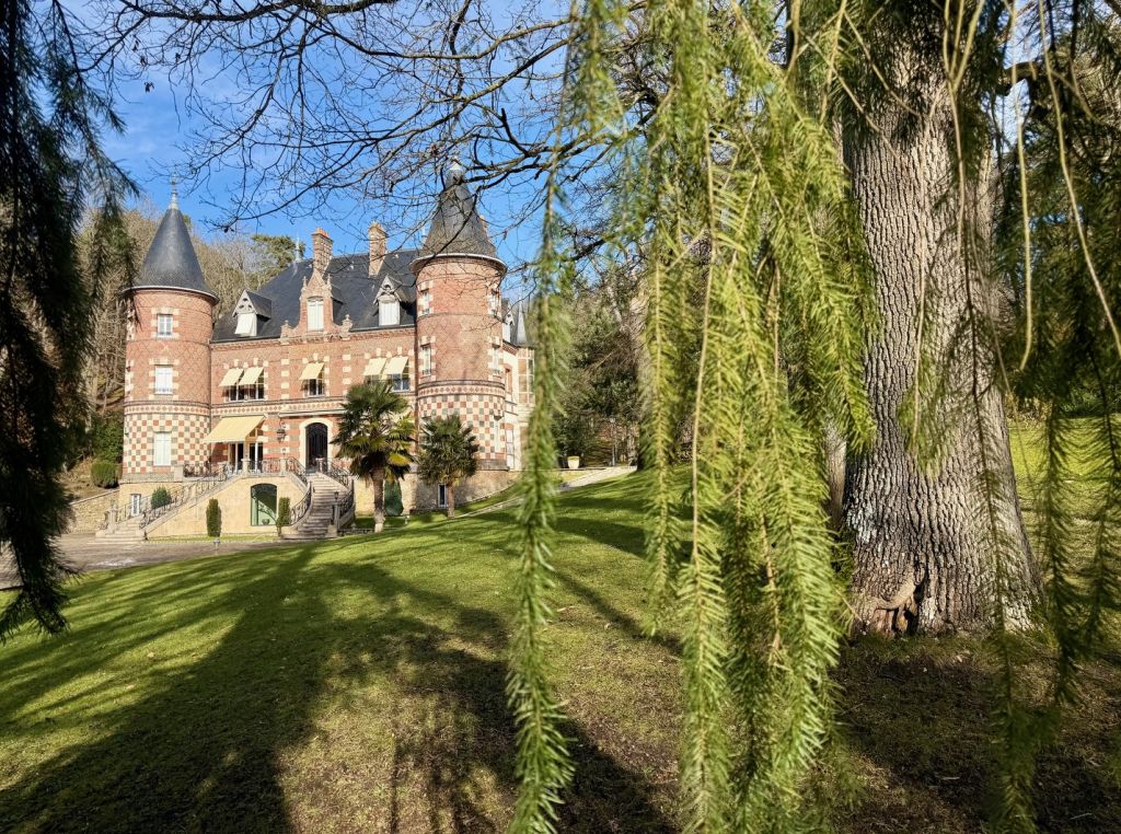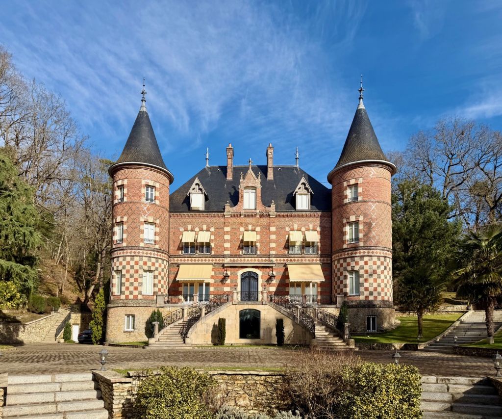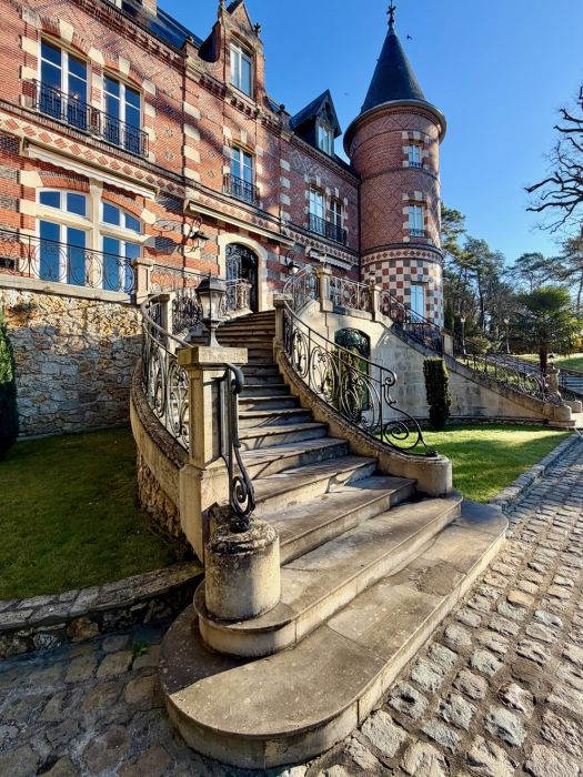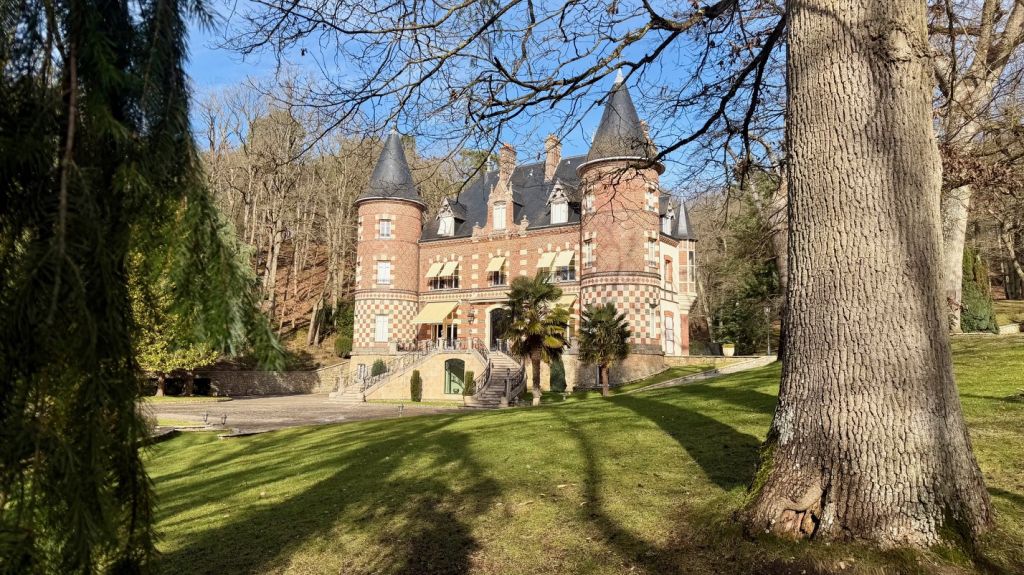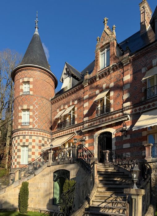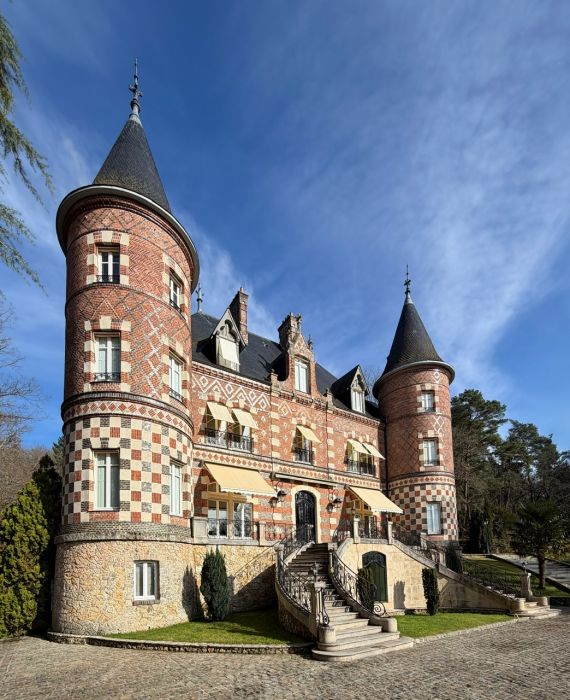 À seulement 35 kilomètres de Paris, là où la capitale s’efface doucement au profit des frondaisons et du silence, le Château de la Fontaine à Auffargis, apparaît comme une parenthèse hors du temps. Édifié pour lui même, l’architecte parisien Jean-François Yvert, l’a réalisé entre 1871 et 1875. Totalisant un peu plus de 1050 m2, il trône au cœur du Parc naturel régional de la Haute Vallée de Chevreuse, enlacé par la forêt de Rambouillet, et embrasse l’abbaye des Vaux-de-Cernay, joyau cistercien lové dans la vallée, se situant à dix minutes à peine. Architecturalement, il rappelle des références du style Louis XIII et des châteaux “ brique et pierre ” de l’Île-de-France : façade ordonnancée en briques et pierre calcaire, plan symétrique avec deux étages et combles, tourelles coiffées de toits en poivrière et toitures à longs pans couvertes d’ardoises ou de tuiles.